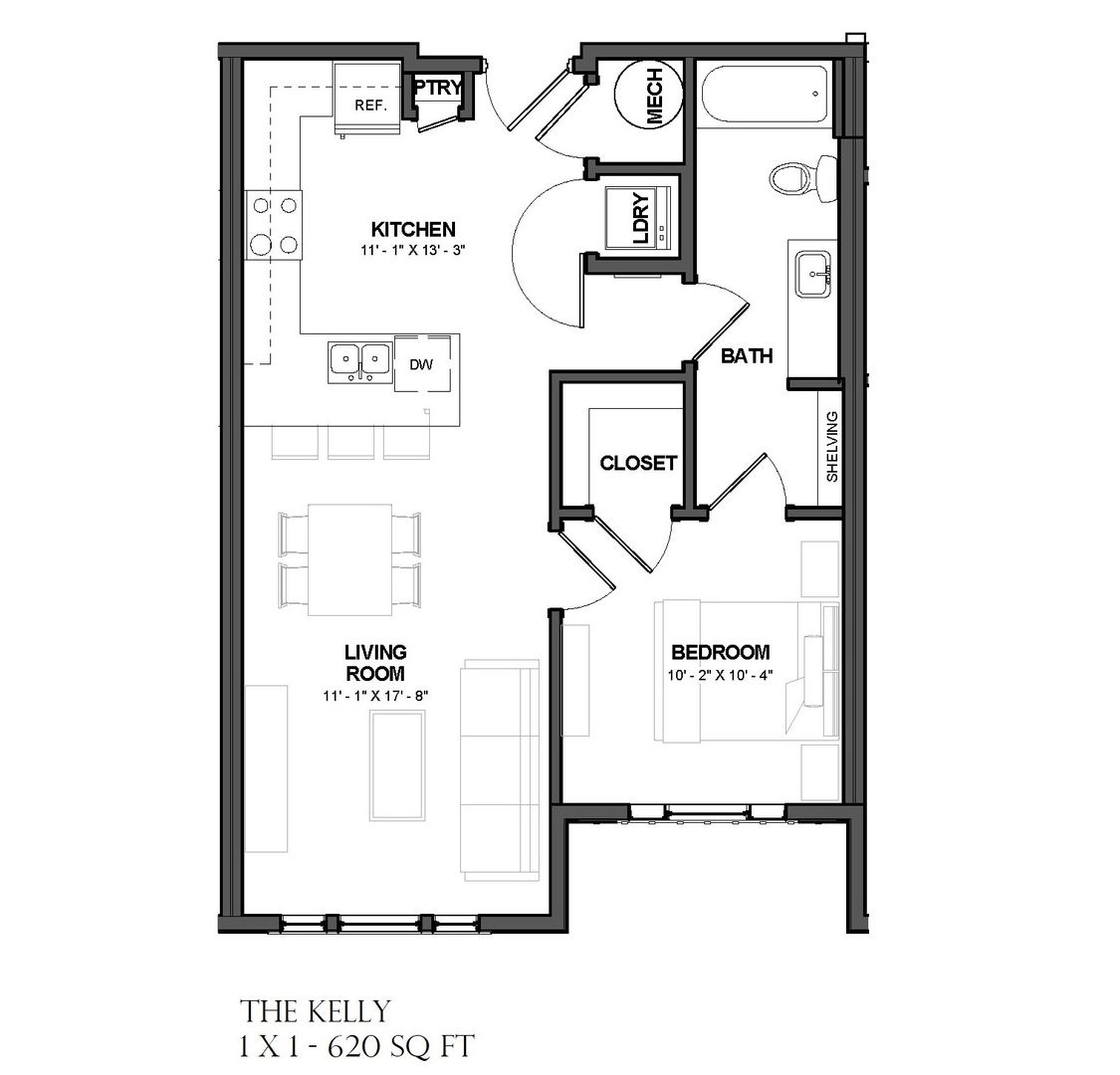 Heritage East- 1 bed, 1 bath Apartment- Available December 15- The Kelly Layout